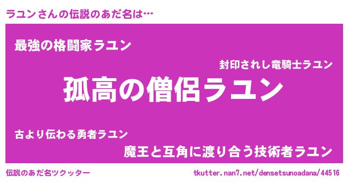 | 女子向けラノベタイトル風あだ名 | 『ラユンなんてお断りですっ。』 |