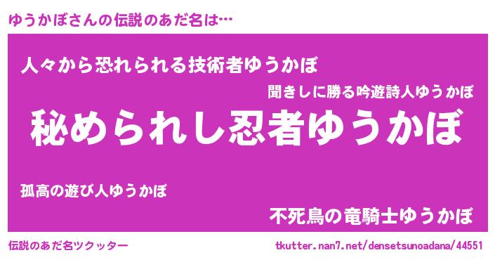 | 男性向けラノベタイトル風あだ名 | 『やはりゆうかぼの青春ラブコメはまちがっている 』 |