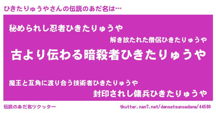 | ヒーロー風カッコイイあだ名 | 『ネオヒキタリュウヤ』『幻影騎士ヒキ』 |