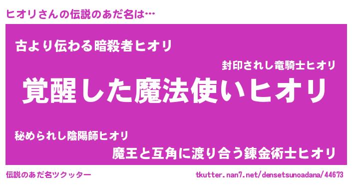 | 男性向けラノベタイトル風あだ名 | 『ヒオリ~年齢イコール彼女いない歴の魔法使い~』 |