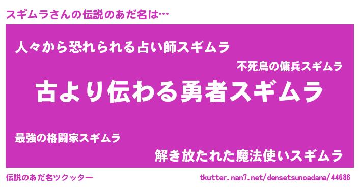 | 意味不明あだ名 | 『永久保存スギムラ』『自称スギムラ』 |