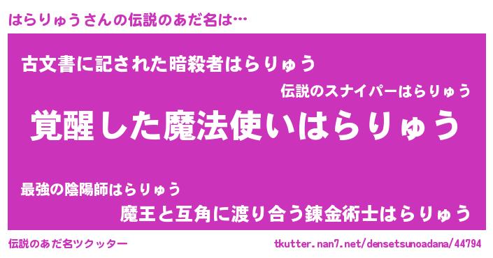 | 男性向けラノベタイトル風あだ名 | 『はらりゅうの嫁は女の子じゃないと思った?』 |