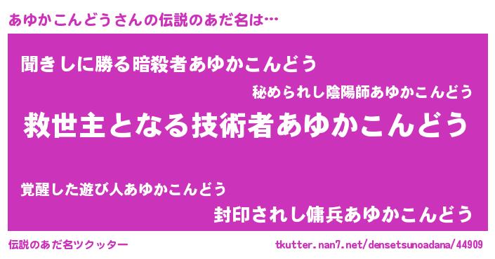 | 男性向けラノベタイトル風あだ名 | 『ノーゲーム・ノーアユカコンドウ』 |