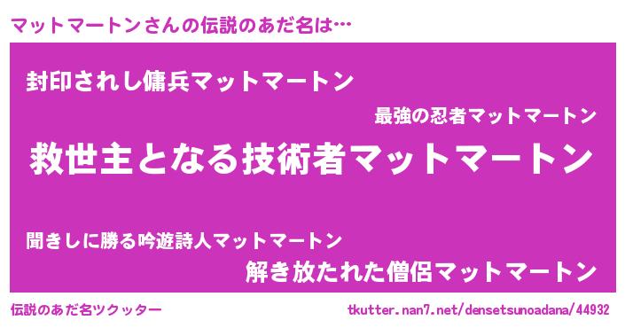| 男性向けラノベタイトル風あだ名 | 『Re:マットマートンから始める異世界生活』 |