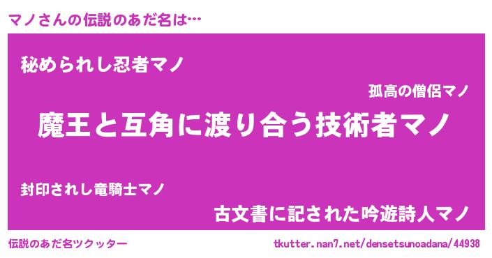 | 男性向けラノベタイトル風あだ名 | 『おまえをオタクにしてやるから、俺をマノにしてくれ! 』 |