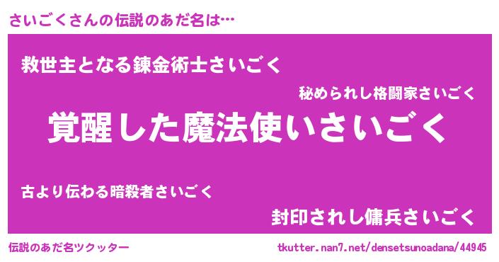 | ヒーロー風カッコイイあだ名 | 『炎刃騎士サイ』『天空の使者さいごく』 |