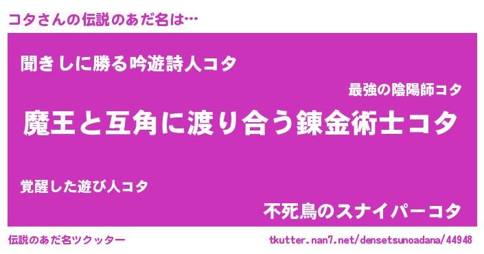 | ヒーロー風カッコイイあだ名 | 『愛の使者コタ』『ネオコタ』 |