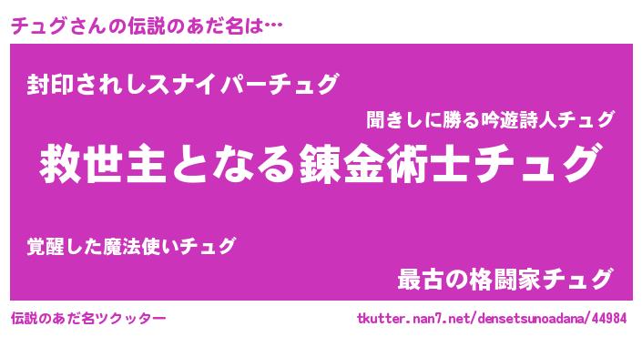 | 女子向けラノベタイトル風あだ名 | 『チュグの玉の輿計画!』『チュグ恋絵巻』 |
