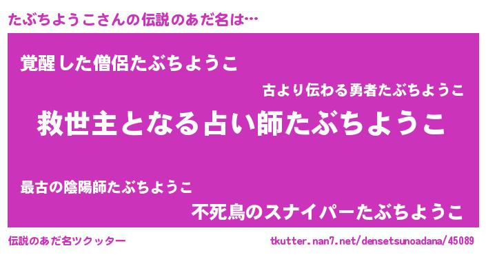 | 男性向けラノベタイトル風あだ名 | 『たぶちようこ~年齢イコール彼女いない歴の魔法使い~』 |
