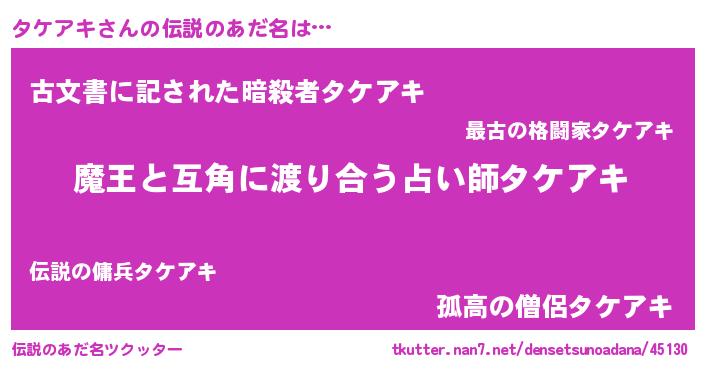 | 女子向けラノベタイトル風あだ名 | 『闇のタケアキ』『死神タケアキの再婚』 |