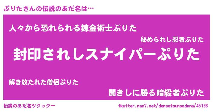 | 意味不明あだ名 | 『自称ぷりた』『ペロリンぷりた』 |