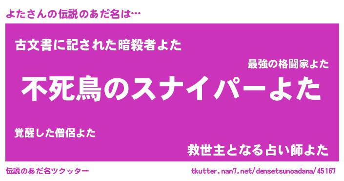 | 男性向けラノベタイトル風あだ名 | 『転生したらよただった件』『よたの憂鬱』 |