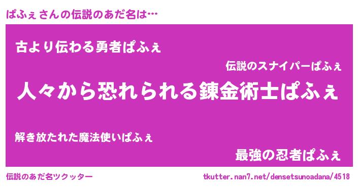 | 男性向けラノベタイトル風あだ名 | 『おまえをオタクにしてやるから、俺をぱふぇにしてくれ! 』 |
