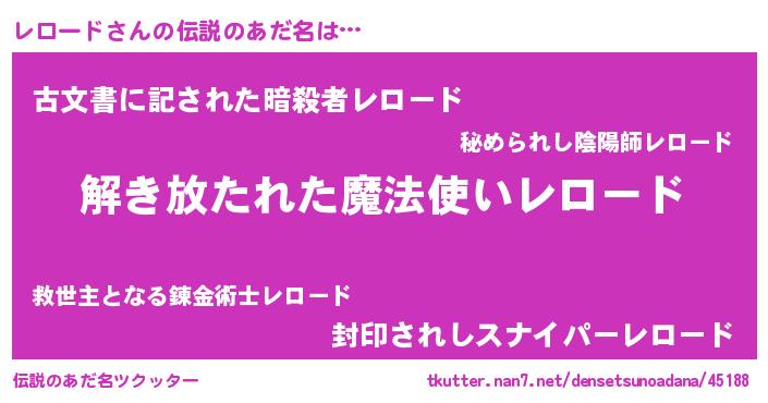 | 男性向けラノベタイトル風あだ名 | 『魔弾の王とレロード』 |