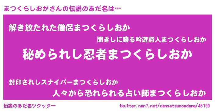| 男性向けラノベタイトル風あだ名 | 『マツクラシオカスレイヤー』 |