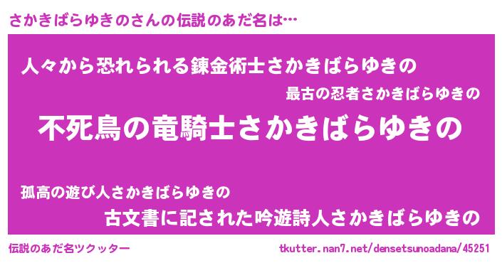 | 男性向けラノベタイトル風あだ名 | 『サカキバラユキノアートオンライン』 |