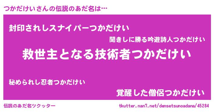 | 男性向けラノベタイトル風あだ名 | 『Re:つかだけいから始める異世界生活』 |