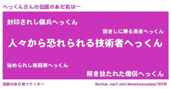 | ヒーロー風カッコイイあだ名 | 『正義の使者へっくん』『暗黒騎士ヘッ』 |
