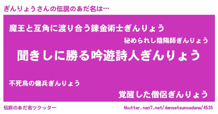 | ヒーロー風カッコイイあだ名 | 『仮面ギンダー』『ネオギンリョウ』 |