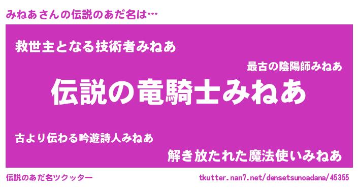 | 男性向けラノベタイトル風あだ名 | 『ミネアスレイヤー』 |