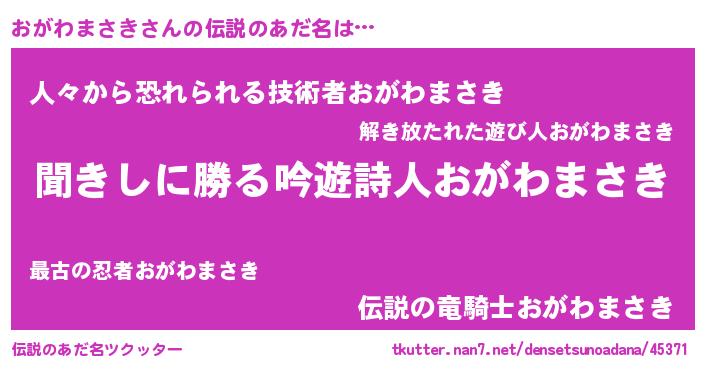 | 男性向けラノベタイトル風あだ名 | 『おがわまさきという概念が存在しない退屈な世界 』 |