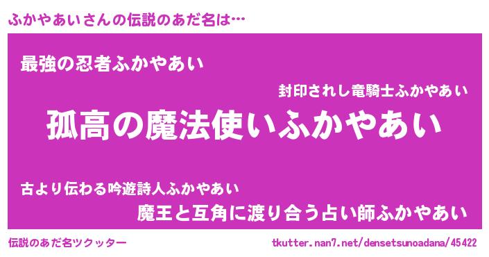 | ヒーロー風カッコイイあだ名 | 『魔戒騎士フカ』『超時空戦士フカヤアイ』 |