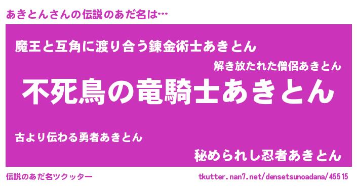 | 女子向けラノベタイトル風あだ名 | 『あきとん姫と円卓の騎士』 |
