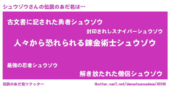 | ヒーロー風カッコイイあだ名 | 『仮面シュダー』『天空の使者シュウゾウ』 |