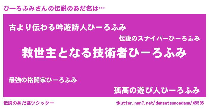 | 男性向けラノベタイトル風あだ名 | 『Re:ひーろふみから始める異世界生活』 |