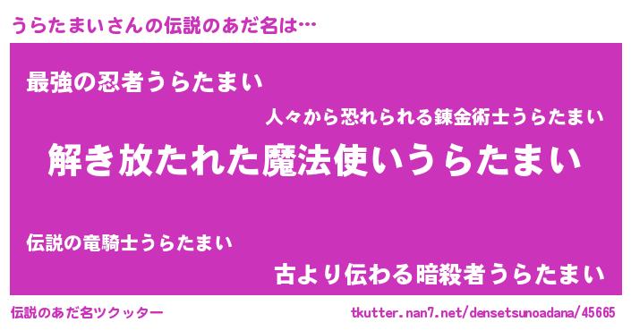 | 男性向けラノベタイトル風あだ名 | 『魔弾の王とうらたまい』 |