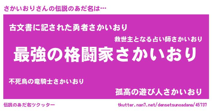 | 男性向けラノベタイトル風あだ名 | 『さかいおり~年齢イコール彼女いない歴の魔法使い~』 |