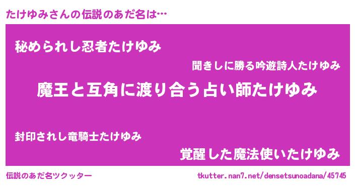 | 女子向けラノベタイトル風あだ名 | 『闇のたけゆみ』『たけゆみの雑貨屋さん』 |