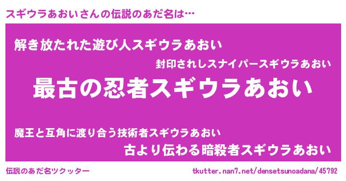 | 男性向けラノベタイトル風あだ名 | 『魔弾の王とスギウラあおい』 |