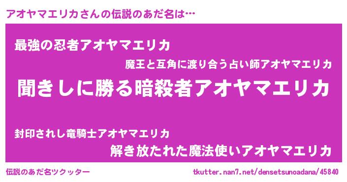 | 女子向けラノベタイトル風あだ名 | 『異世界で失敗しない100のアオヤマエリカ』 |