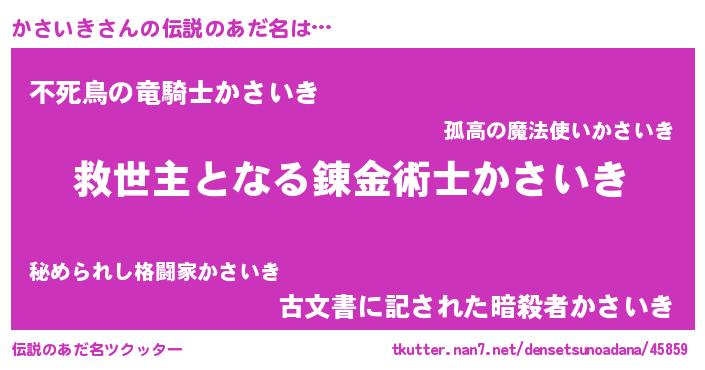 | 男性向けラノベタイトル風あだ名 | 『この素晴らしい世界にかさいきを!』 |
