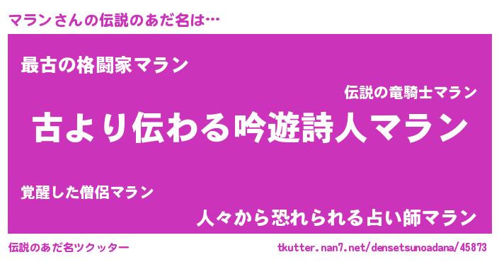 | 男性向けラノベタイトル風あだ名 | 『マランという概念が存在しない退屈な世界 』 |