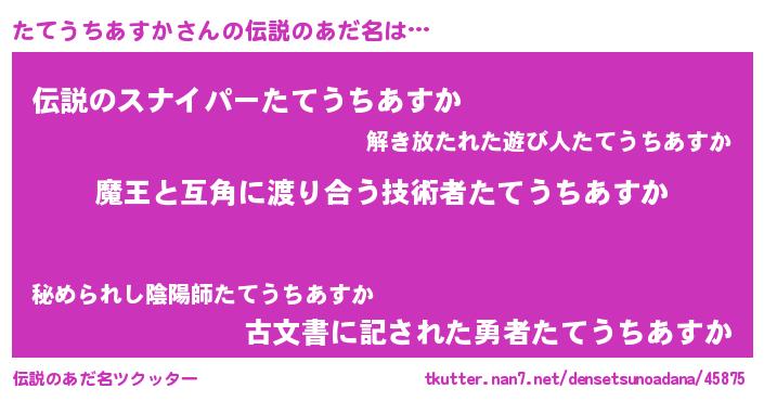 | ヒーロー風カッコイイあだ名 | 『仮面タテダー』『ネオタテウチアスカ』 |
