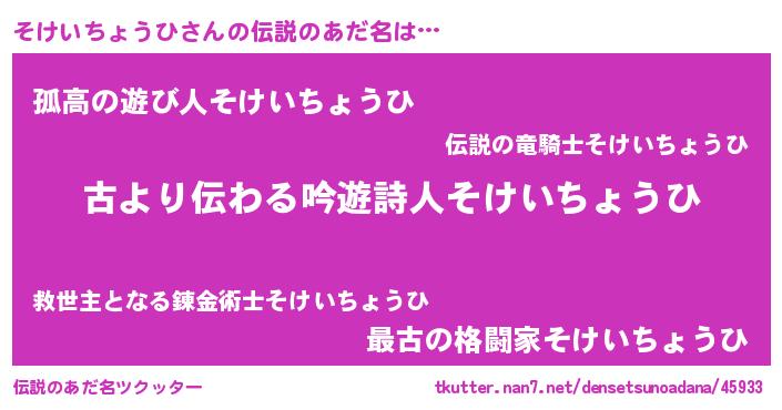 | 男性向けラノベタイトル風あだ名 | 『そけいちょうひという概念が存在しない退屈な世界 』 |