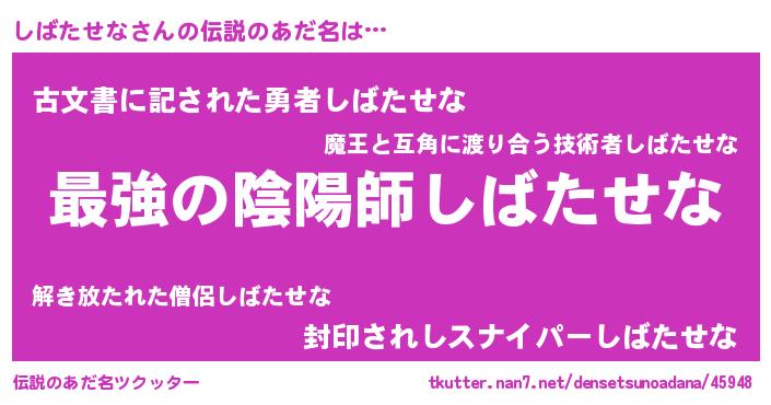 | 男性向けラノベタイトル風あだ名 | 『この素晴らしい世界にしばたせなを!』 |