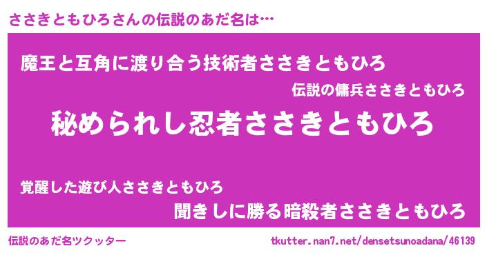 | 男性向けラノベタイトル風あだ名 | 『魔弾の王とささきともひろ』 |