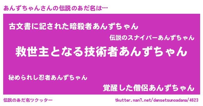 | 男性向けラノベタイトル風あだ名 | 『あんずちゃん~年齢イコール彼女いない歴の魔法使い~』 |