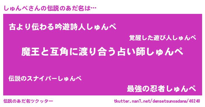 | 男性向けラノベタイトル風あだ名 | 『冴えないしゅんぺの育てかた』 |