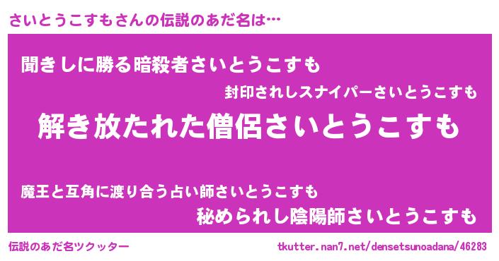 | 意味不明あだ名 | 『とにかく怪しいさいとうこすも』 |