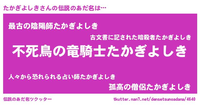| 女子向けラノベタイトル風あだ名 | 『たかぎよしき姫と円卓の騎士』 |