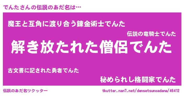 | 男性向けラノベタイトル風あだ名 | 『でんたに滅ぼされるだけの簡単なお仕事です』 |