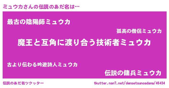 | 男性向けラノベタイトル風あだ名 | 『おまえをオタクにしてやるから、俺をミュウカにしてくれ! 』 |
