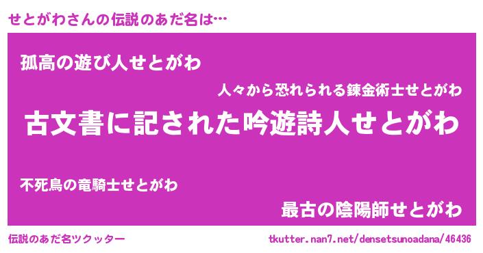 | ヘコむあだ名 | 『せとがわ(小並感)』『せとっちょ』 |