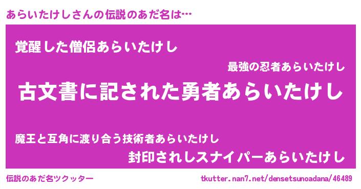 | 意味不明あだ名 | 『住所不定無職あらいたけし(95歳)』 |
