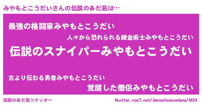| 胡散臭い通販商品みたいなあだ名 | 『必ず成功する霊験あらたかなお札…その名も「みやもとこうだい」』 |