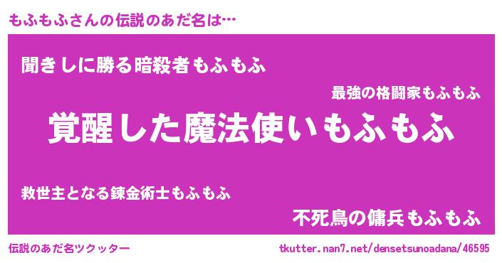 | 男性向けラノベタイトル風あだ名 | 『もふもふ~年齢イコール彼女いない歴の魔法使い~』 |